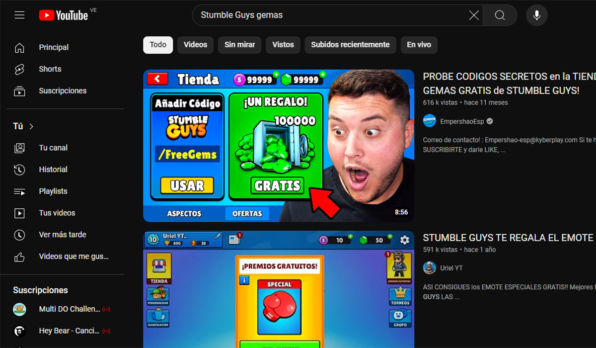 Muchos YouTubers de Stumble Guys realizan sorteos de gemas o skins para sus seguidores.